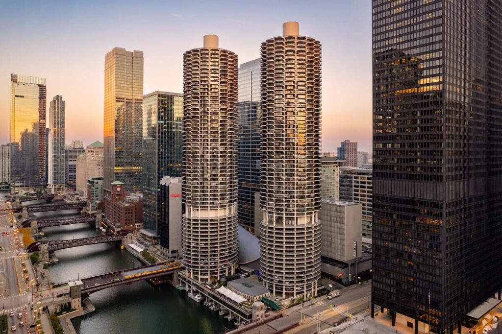 • Marina City – the iconic “corn cob” towers designed by Bertrand Goldberg in the 1960s, rising right from the riverfront.