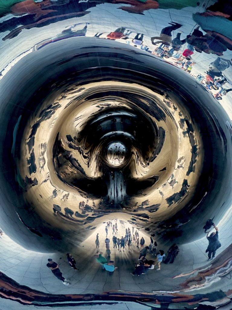 From the outside, the mirrored surface captures the Chicago skyline, Millennium Park, and the ever-changing Midwestern sky. On a sunny day, the reflections are crisp and dazzling; at night, the lights of the city ripple across its surface like a painting in motion. In winter, it gleams against the snow; in summer, it shimmers under the sun.
