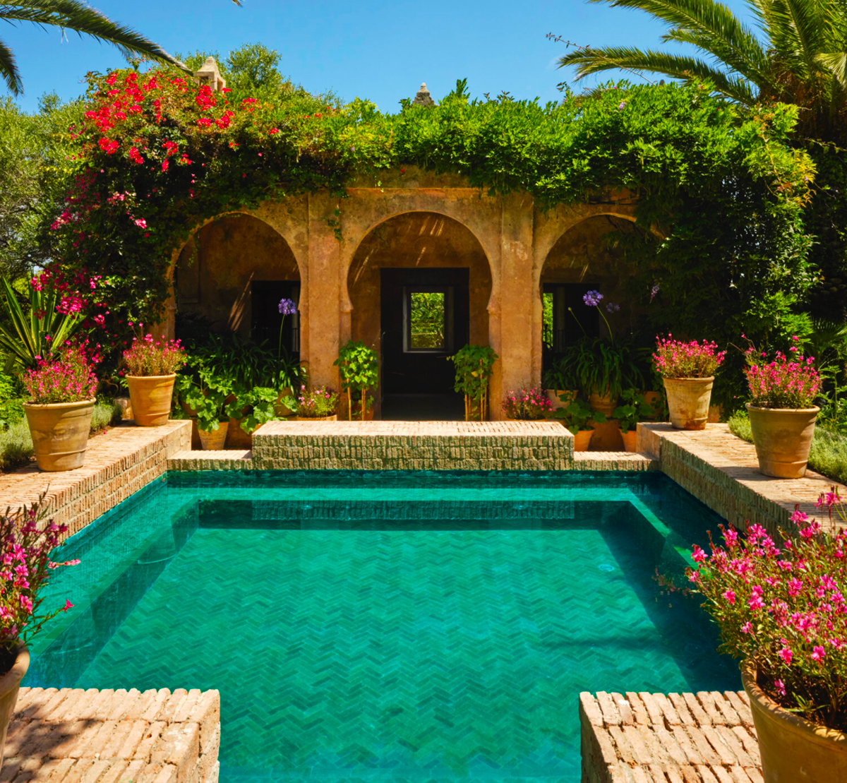The villa’s terraced gardens are its beating heart—a labyrinth of color and calm that descends toward a turquoise pool framed by cypress and palm trees. This pool, surrounded by lemon trees and tiled sunbeds, feels utterly cinematic, reminiscent of the Riviera’s golden age. Hidden benches and secluded alcoves invite reading, sketching, or simply daydreaming in the Tangier light. It’s no wonder artists and writers find endless inspiration here; Villa Mabrouka is both muse and masterpiece.